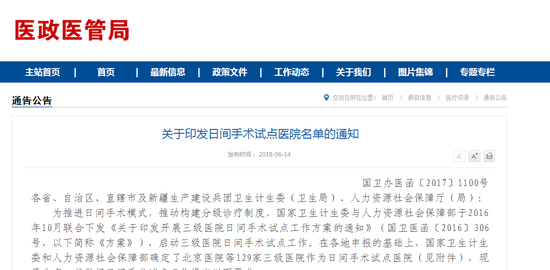 近日,国家卫健委正式发布《关于印发日间手术试点医院名单的通知》。明确在各地申报的基础上,国家卫生计生委和人力资源社会保障部确定了北京医院等129家三级医院作为日间手术试点医院。