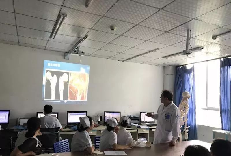 本次护理业务查房对象是一位73岁的髋关节置换术后并发胰腺炎的老年男性患者,为了提升护士基础知识,字国祚医生对髋关节解剖及髋关节置换手术方式进行了生动细致讲解,责任护士罗开兰介绍病人的病情,提出病人的护理问题及护理措施。