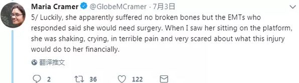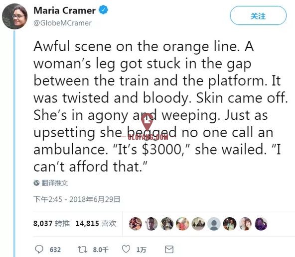 前段时间美国波士顿的一位记者在车站下车的时候用推特记录了一件恰好发生的事故,一位女性在下车的时候脚被卡在列车和月台中间,双腿扭曲,血肉模糊甚至可以看到骨头。