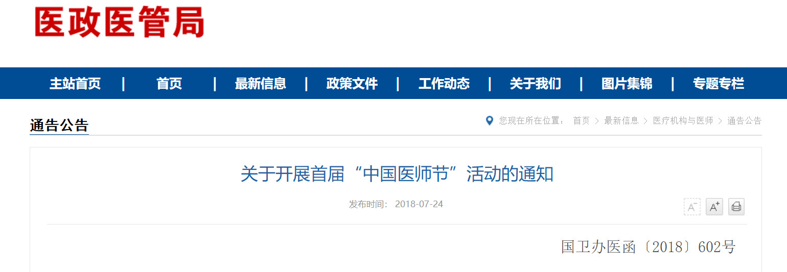 去年11月20日,国务院发布消息,国务院批复了卫计委《关于申请设立“中国医师节”的请示》(国卫办报〔2017〕138号),同意自2018年起,将每年8月19日设立为“中国医师节”。所以,2018年8月19日就是首届中国医师节。