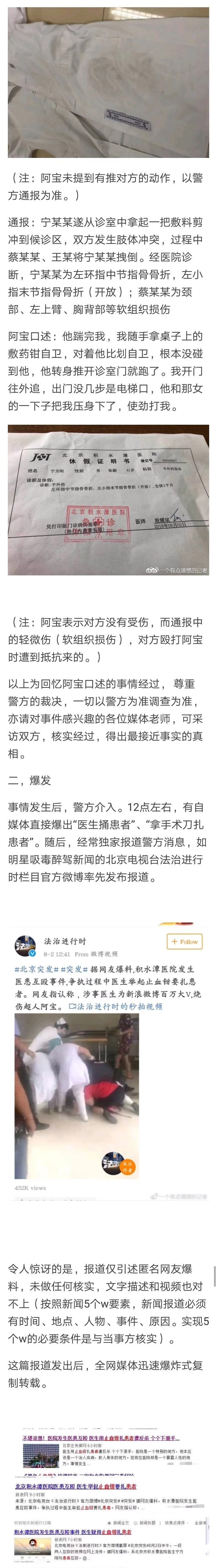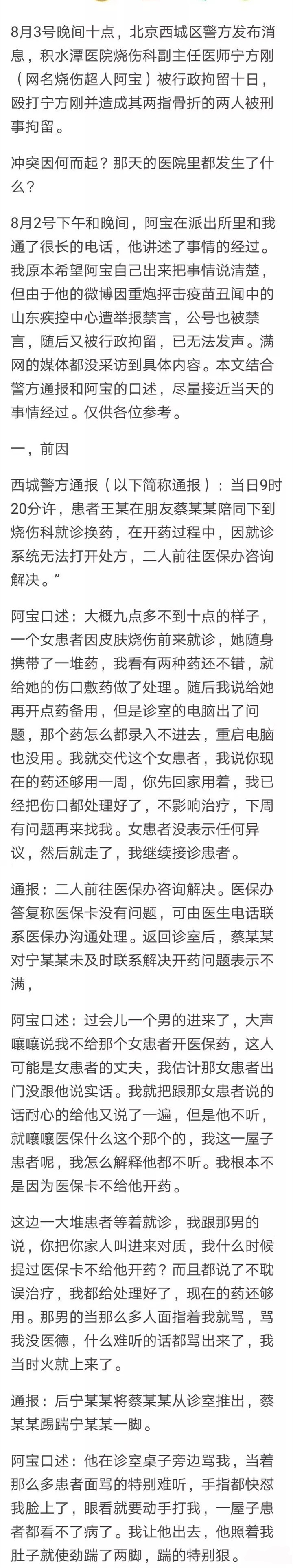 8月2日,微博号“法制进行时“发布了一段医生和患者“互殴”的视频引爆网络。紧接着@时间新闻 称:“从权威部门获悉,视频中一方为北京积水潭医院医生宁方刚(烧伤超人阿宝 )。”