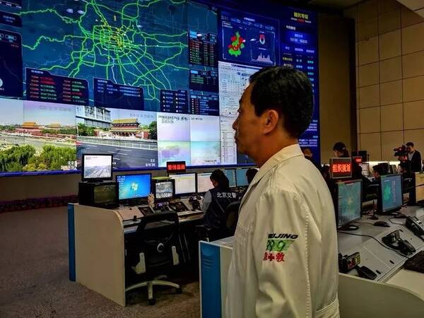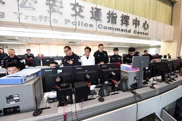 北京市公安交管局指挥中心内,交警、999急救人员在紧张监控急救车队情况