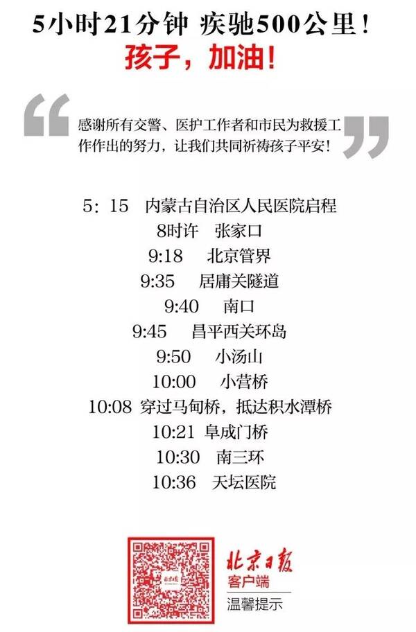 昨天凌晨5时15分,在999医护人员的护送下,载着孩子的救护车,从内蒙古自治区人民医院出发。北京交警已经提前做好预案,昌平、海淀、丰台交通支队民警提前备岗,随时等待为抵达的急救车队带道。