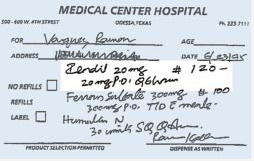 美国医学会曾在7年内颁布3条规定以敦促医生们“改进潦草的处方笔迹”。2000年英国医学杂志(BMJ)曾报道了一桩官司:美国一名医生为心绞痛患者开具了“硝酸异山梨酯20mg,每6小时一次口服(Isordil,20mg,Q6h)”的处方,然而由于字体过于“飘逸”,药师将Isordil误认作Plendil(波依定,降压药),导致患者过量服用后心脏病发作,数日后死亡。最终法院认定处方医师和药师负同等责任,各赔偿患者亲属225000美元,真可谓4个字母引发的悲剧。
