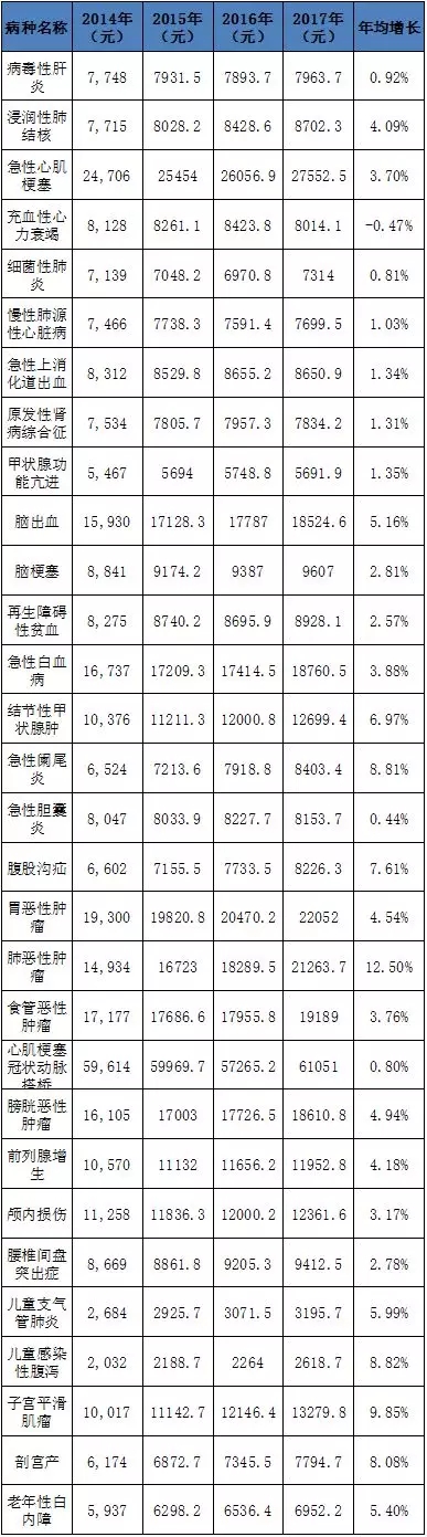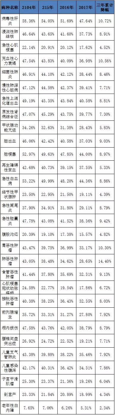 这30个病种中,除个别病种年均药费在2014-2017年期间略有上升外,绝大多数病种的药费也有不同程度的下降。