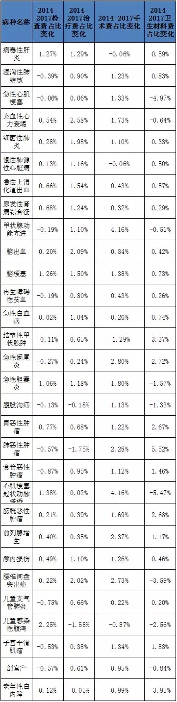 从2014-2017年检查费占比变化、治疗费占比变化、手术费占比变化和卫生材料费占比变化来看,大部分出现上升。