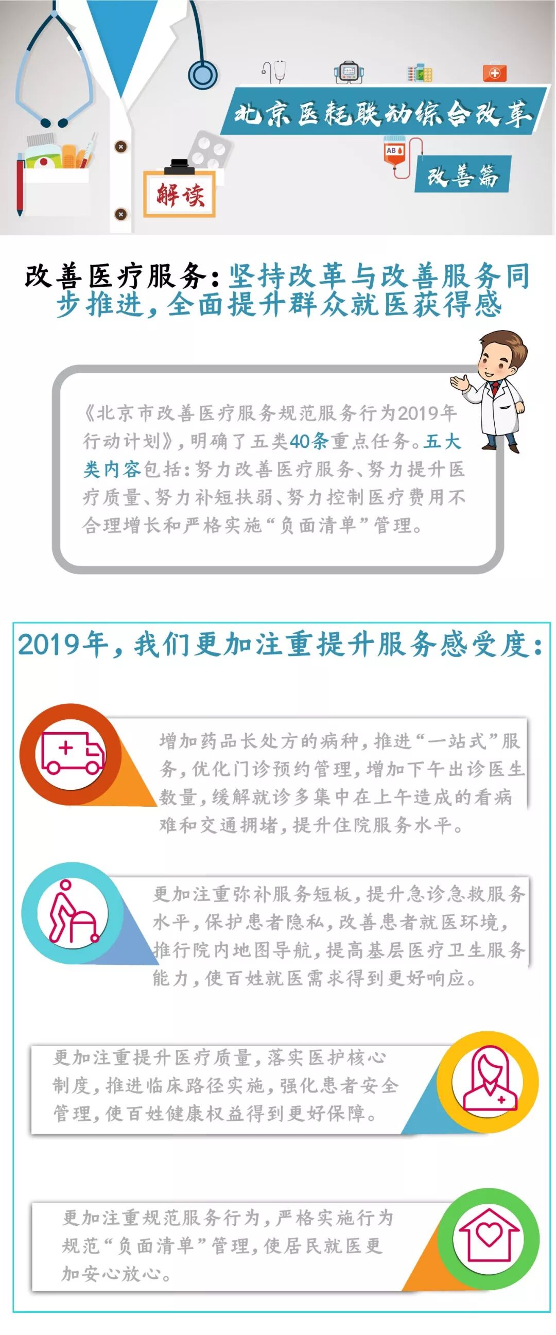 北京市卫生健康委按照“改革与改善同步推进、全面提升群众就医获得感”的原则,制定了《北京市改善医疗服务规范服务行为2019年行动计划》,明确了5类40条重点任务。