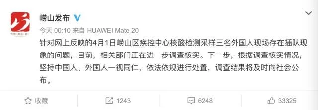 针对网上反映的4月1日崂山区疾控中心核酸检测采样三名外国人现场存在插队现象的问题,目前,相关部门正在进一步调查核实。下一步,根据调查核实情况,坚持中国人、外国人一视同仁,依法依规进行处置,调查结果将及时向社会公布。