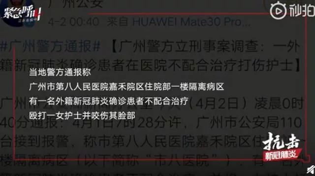 4月1日7时28分许,广州市公安局110台接到报警,称广州市第八人民医院嘉禾院区住院部一楼隔离病区,有一名外籍新冠肺炎确诊患者不配合治疗,并将一女护士打伤。广州白云警方立即派员到场处置。