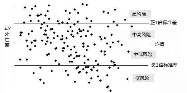 低风险组计算过程:首先计算所有DRGs覆盖病例的死亡率,对死亡率取自然对数,处在负1倍标准差以外的DRG组为低风险组,如下图所示: