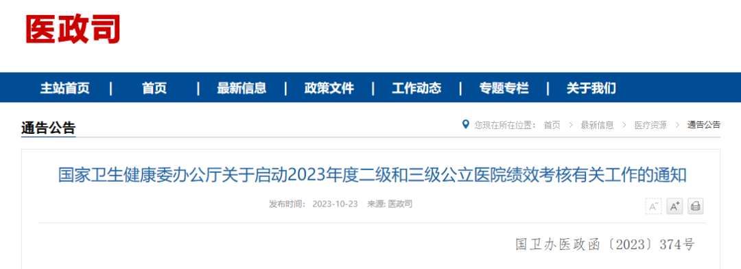 10月23日,国家卫生健康委官网发布《关于启动2023年度二级和三级公立医院绩效考核有关工作的通知》(下称《通知》),并部署了与绩效考核相关的工作要求。